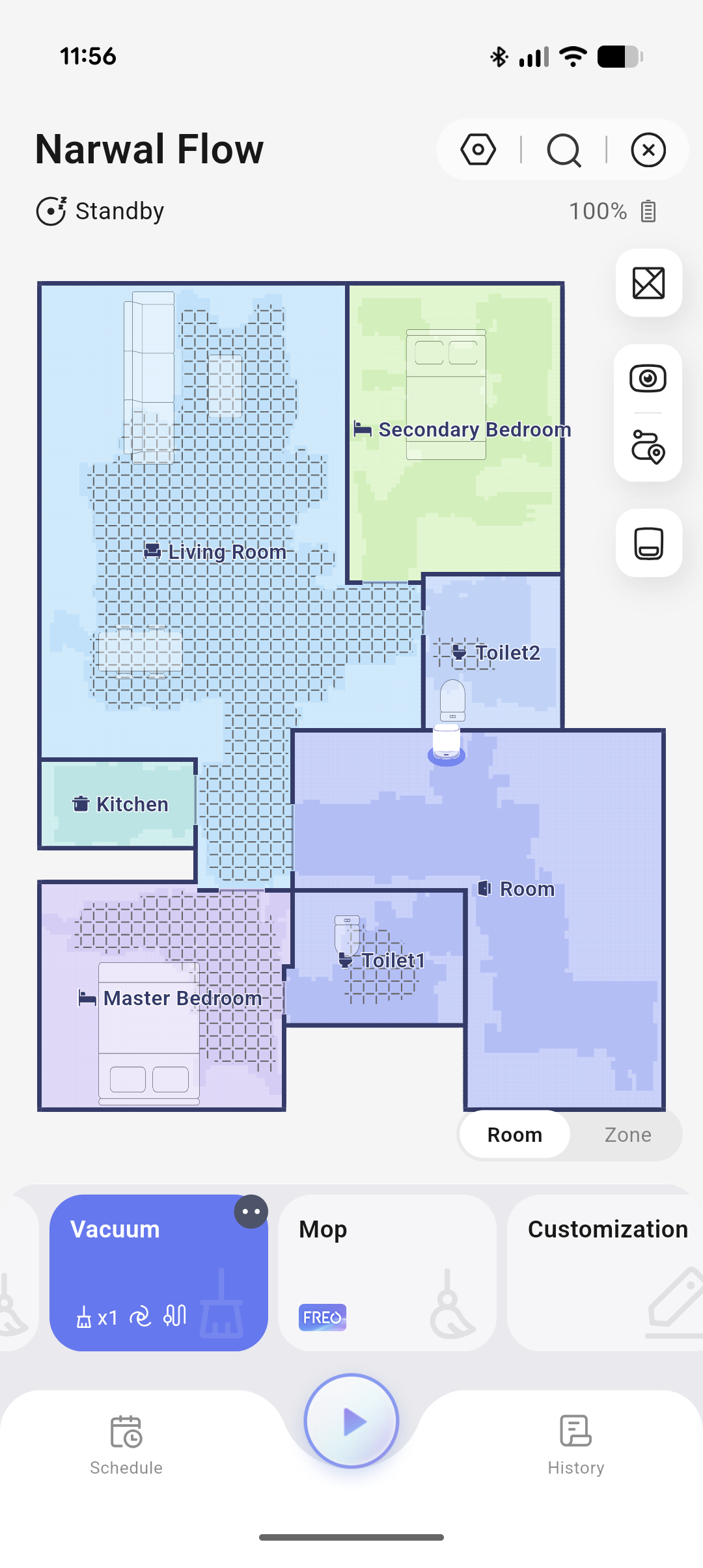 Narwal’s app is where the Flow really comes to life. Setup is dead simple: once it’s mapped your house, you can divide up rooms, set cleaning schedules, and drop in no-go zones. You’ve got the usual options — vacuum only, mop only, or both — but you can also choose whether you want it to vacuum first then mop, or do the lot in one pass.